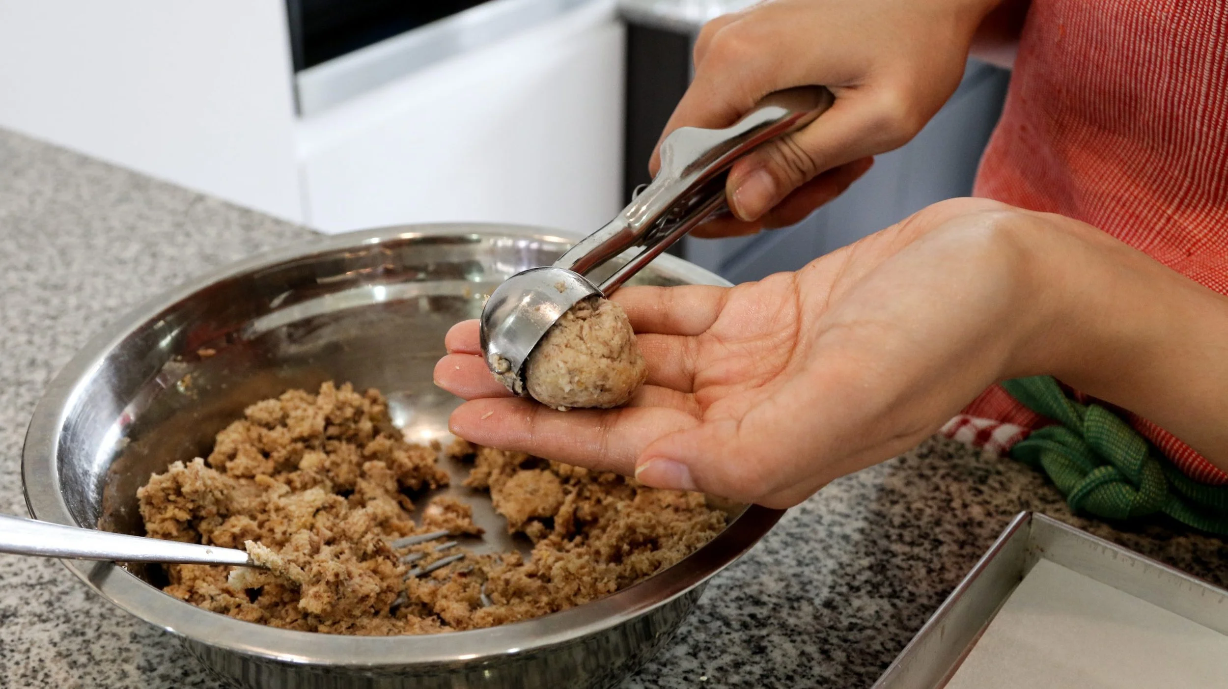 Use your hands or tablespoons to form the mixture into small balls and place them on a rimmed baking sheet, and refrigerate about 10 minutes.